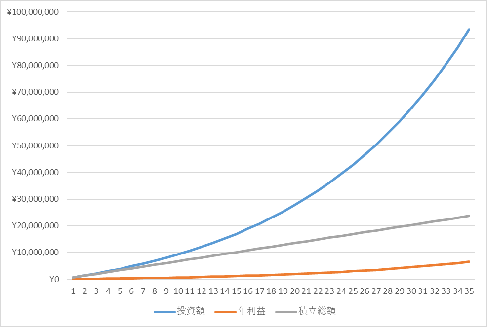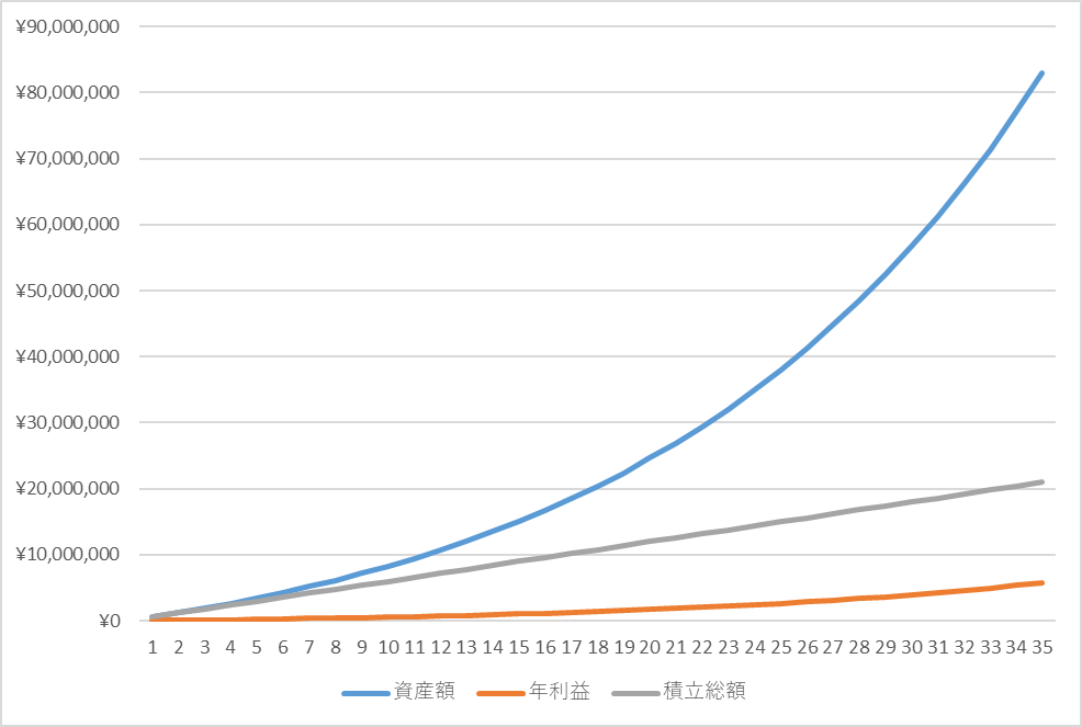 下図の青いラインを見ていただければ分かると思いますが2次関数的に資産額が増えていますよね。